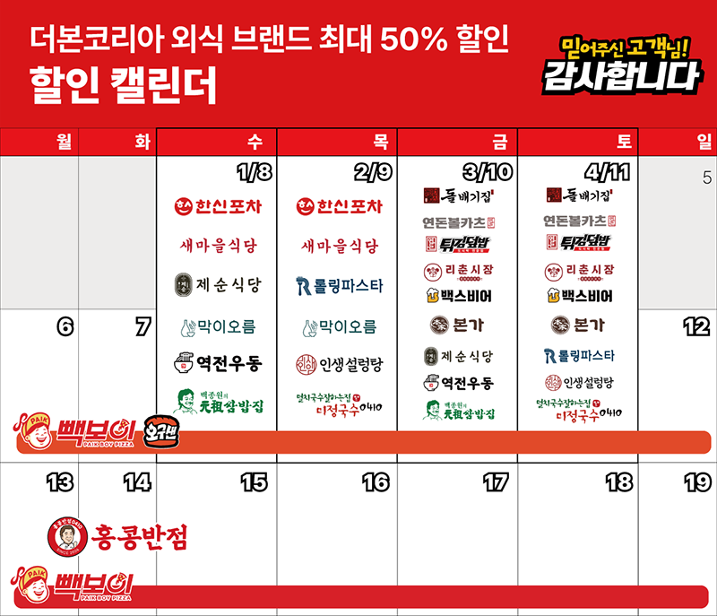 | 2026.03.23 | 더본코리아 고객 감사 외식 통합전 최대 50% 할인 |