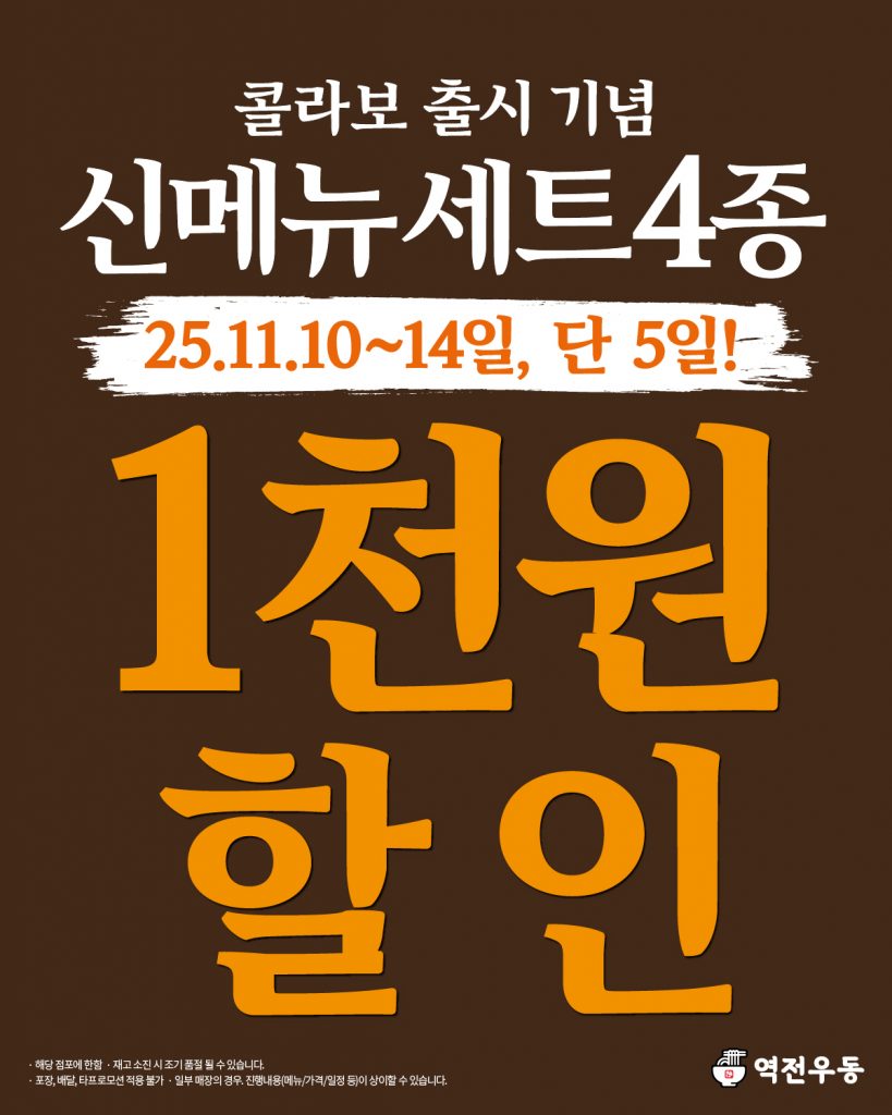 | 2025.11.10 | 역전우동, 구운어묵튀김우동 출시 기념 신메뉴 세트 4종 천원 할인 (11/10~11/14) |