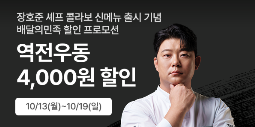 배달의민족 할인 프로모션 (10/13~10/19)역전우동, 장호준 셰프 콜라보 기념 배달의민족 4,000원 할인 프로모션을 진행합니다. 📌행사 기간 : 10/13(월) ~ 10/19((일) 📌행사 내용 - 배달의민족 픽업, 가게배달, 배민배달 4,000원 할인 ※배민 할인 관련 자세한 사항 및 진행 매장은 '배달의 민족' 앱에서 확인해주세요!